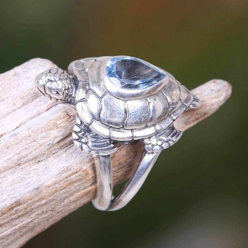 925 Sterling Silver Animal Theme Turtle Ring with Blue Topaz 'Turtle Empathy' Item ID: 2670122137