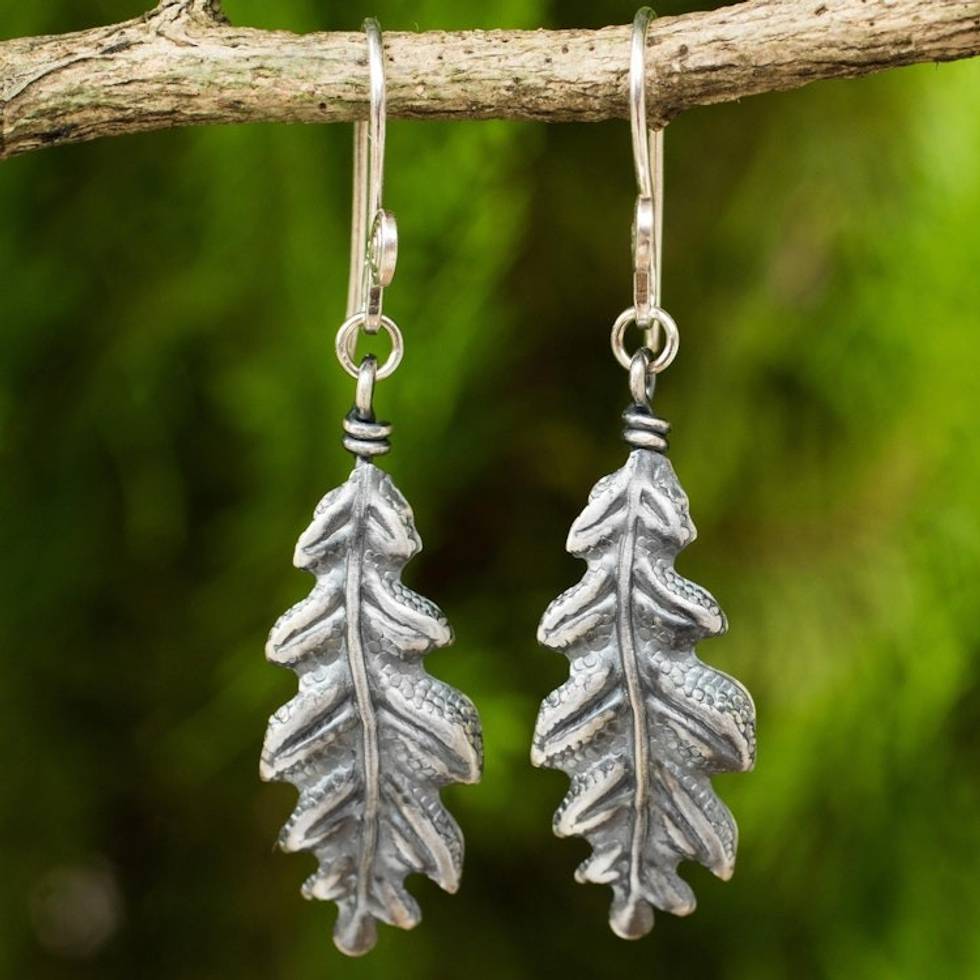 "Thailand's Withaya Cheunjit shares the beauty of nature with earrings shaped like oak tree leaves. The sterling silver earrings are crafted by hand with oxidized contrasts."
