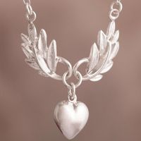 "Artist Maria del Carmen Vargas of Surco, Peru says, 'Inspiration is all around me. I express ideas of life and nature in all their forms.' In this sterling silver pendant necklace, a simple heart is framed by two sets of leaves which are also reminiscent of wings."