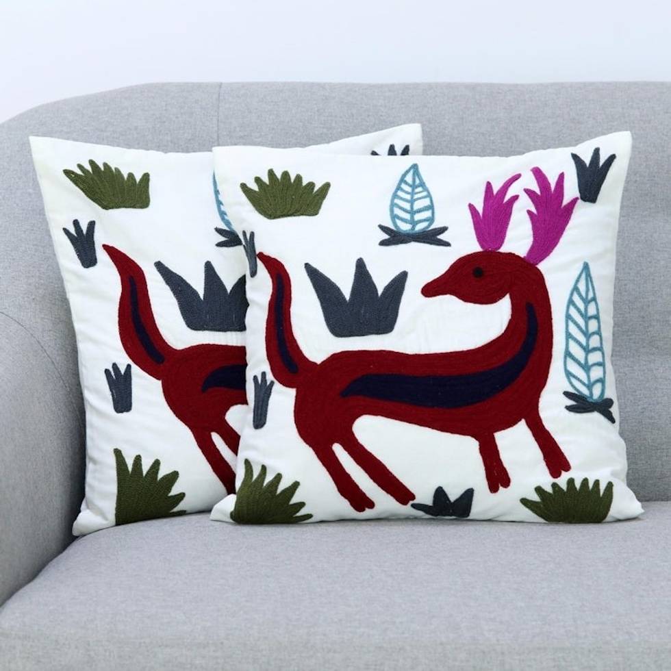 Aari Embroidery Folk Art Deer Theme Cushion Covers Pair 'Royal Deer' Item ID: 2671792608