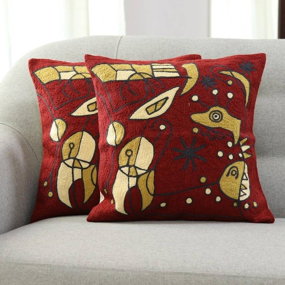 Abstract Embroidered Cotton Cushion Covers from India Pair 'Abstract Expression' Item ID: 2671792253