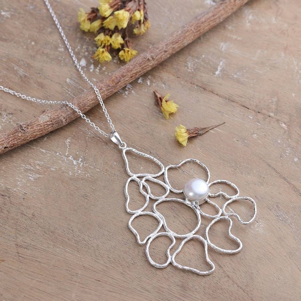 Abstract Floral Sterling Silver Pendant Necklace with Pearl 'Oneiric Petals' Item ID: 2671787057