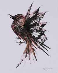"Elegant yet edgy, this abstract acrylic painting by India's Sunil Jaiswal portrays a dynamic bird captured mid-flight, executed with a dramatic palette of deep blacks, warm browns and delicate blush pinks. Its wings burst outward in sharp, angular forms, with splattered white and pink accents that create a sense of motion and spontaneity. Shaped with a rhythmic brushwork, the bird's body suggests tension and readiness, while the vivid red-orange eye adds a piercing focal point."