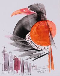 Abstract Modern Acrylic on Paper Painting of Exotic Bird 'City Sentinel' Item ID: 2676665456