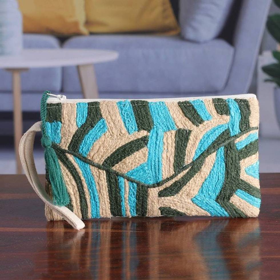 Abstract-Themed Blue and Beige Embroidered Cotton Wristlet 'Creative Blast' Item ID: 2676664321