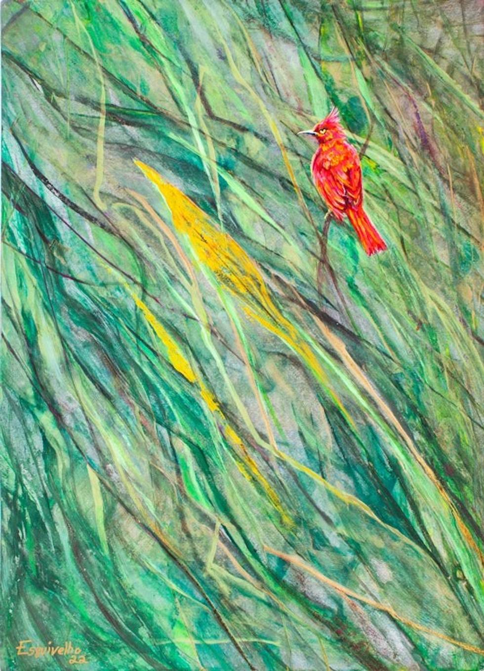 Acrylic and Dyes on Paper Painting of Red Bird in Grasslands 'Red Bird in Green Grassland' Item ID: 2669898929