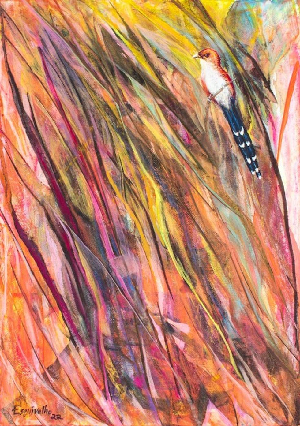 Acrylic and Natural Dyes on Paper Painting of A Cuckoo Bird 'Cuckoo in Rainbow Grassland' Item ID: 2669903790