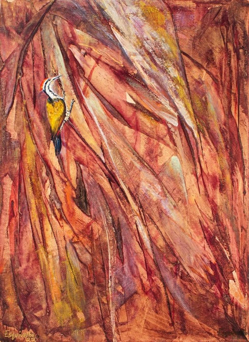 Acrylic and Natural Dyes on Paper Painting of A Woodpecker 'Woodpecker on Log' Item ID: 2669903795