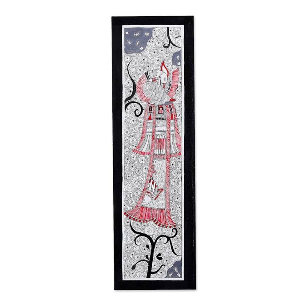 "What I love most about my painting is the blending of modern values along with traditional ones. The use of flat bright colors in Madhubani and the shading style with fine motifs created in traditional Kalighat paintings is amazing.