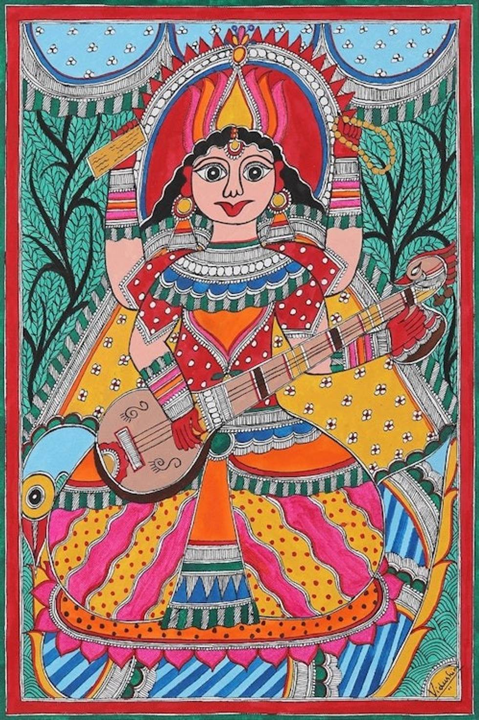 Acrylic Madhubani Painting on Handmade Paper 'Saraswati's Song' Item ID: 2671787670