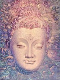 "Artist Rawat Vongla of Thailand works in acrylic on canvas to create this original composition, which features the Greco-Buddhist representation of Buddha. The Hellenistic influence on images of Buddha can be seen in the idealistic realism of the figures, the draped clothing so typical of Greek statues, and the curled hair which is representative of the Mediterranean. Vongla uses a muted palette of purple, rose, blue and green to create a dream-like feeling."