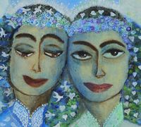 Back in Brazil, she began expressing her art through painting. "My favorite themes are angels and Madonnas with expressions of happiness in vivid colors that transmit the sensations of peace and harmony that I feel when painting, in spite of working with physical limitations, lying with the canvas on my thorax for reasons of health," the artist says.