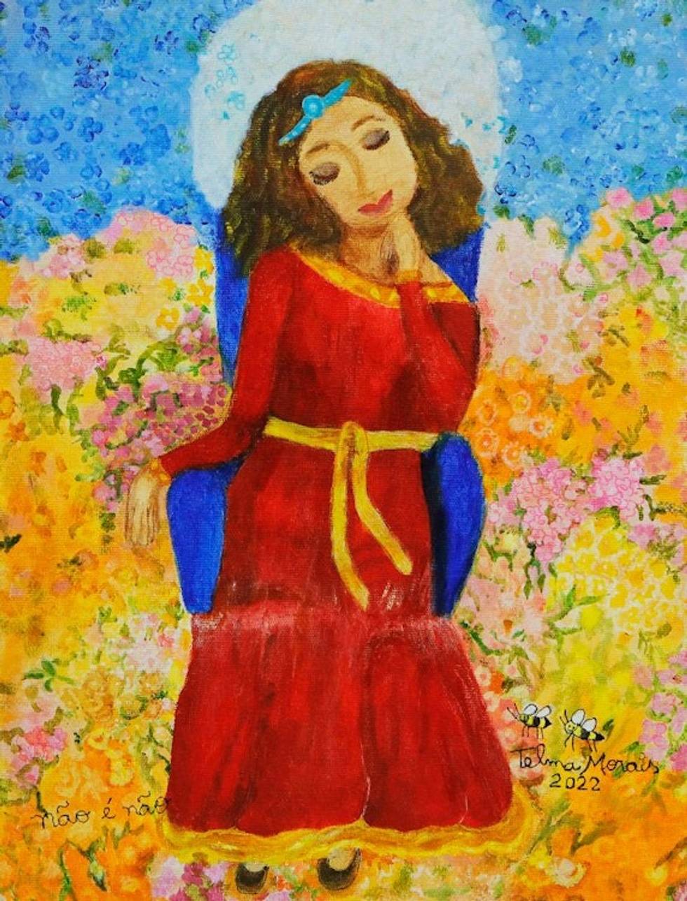 Back in Brazil, she began expressing her art through painting. "My favorite themes are angels and Madonnas with expressions of happiness in vivid colors that transmit the sensations of peace and harmony that I feel when painting, in spite of working with physical limitations, lying with the canvas on my thorax for reasons of health," the artist says.