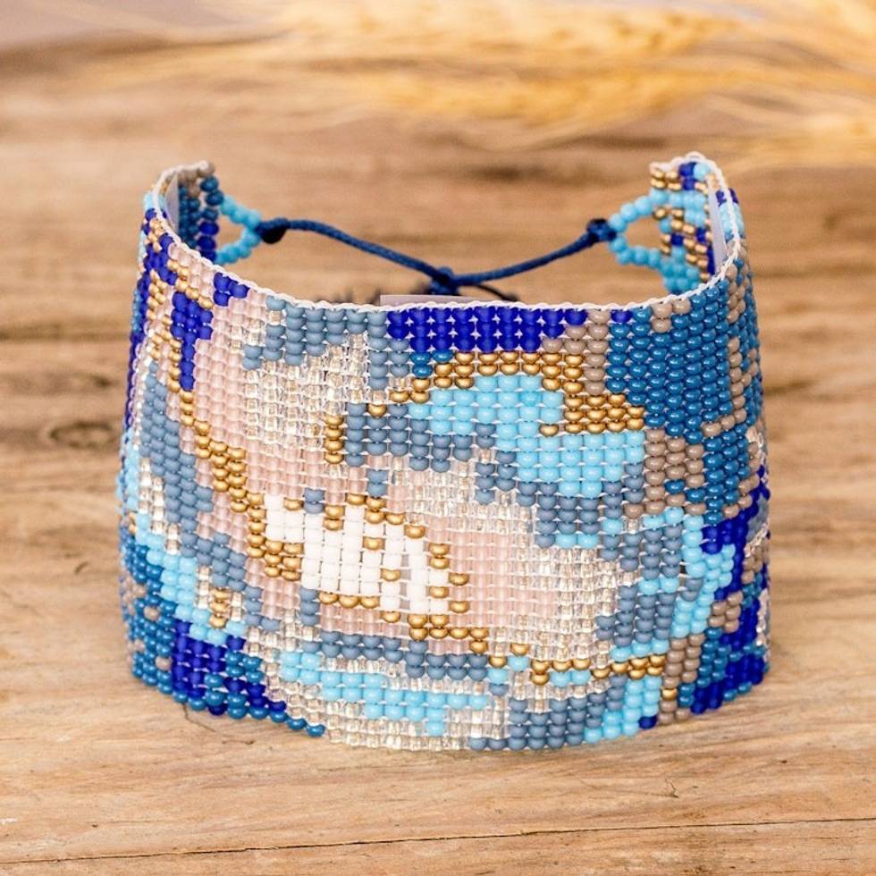 Adjustable Blue and Beige Glass Beaded Wristband Bracelet 'Serene Winds' Item ID: 2671769094