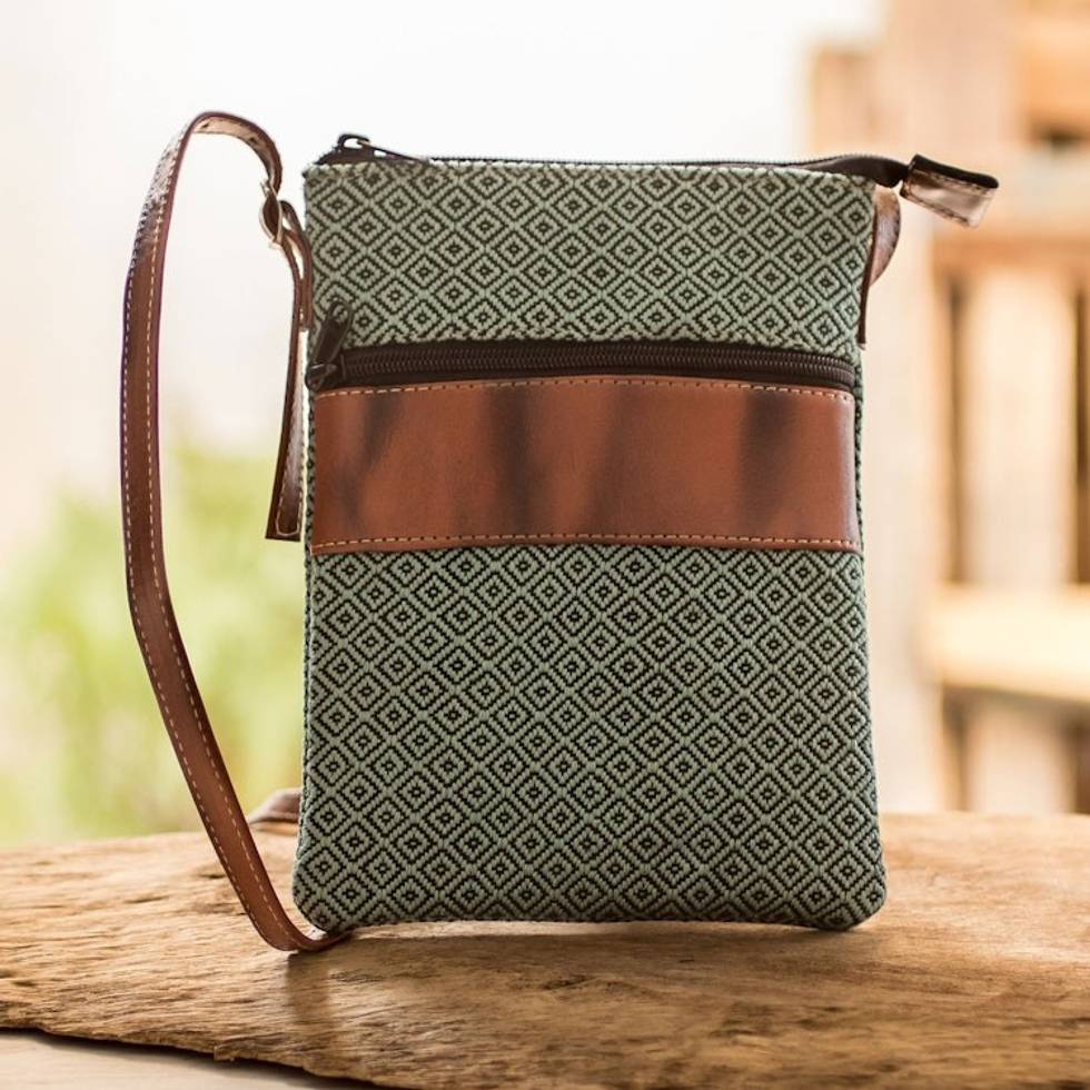 Adjustable Cotton and Leather Sling Bag 'Comalapa Diamonds in Mint' Item ID: 2671771635