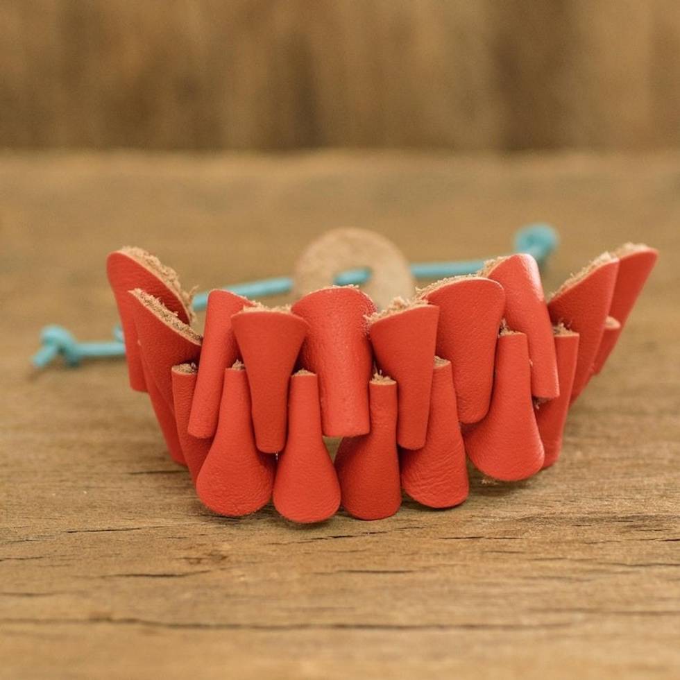 "This unique wristband is the original design of Costa Rica's Rebeca Zamora. The bracelet is crafted entirely of genuine leather in complementary vermilion and sky blue hues. The bracelet's length can be adjusted as desired."