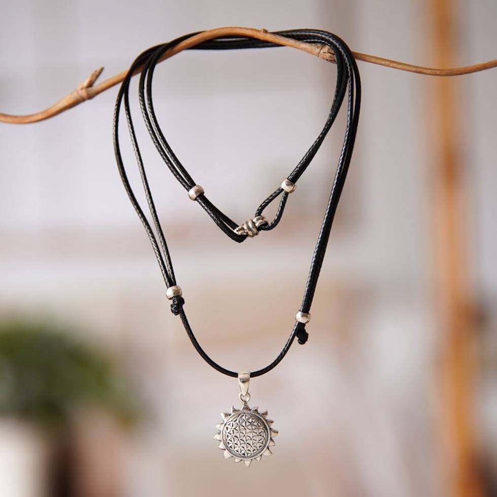 "Every Balinese summer is blessed with the warm and luminous rays of the sun, inspiring Maria and Gennadii to create a gorgeous homage to this magnificent star. Working on an adjustable black nylon cord, the team captures the sun's beauty in a polished sterling silver pendant dangling at the bottom of the design, which is also accented with shiny beads."