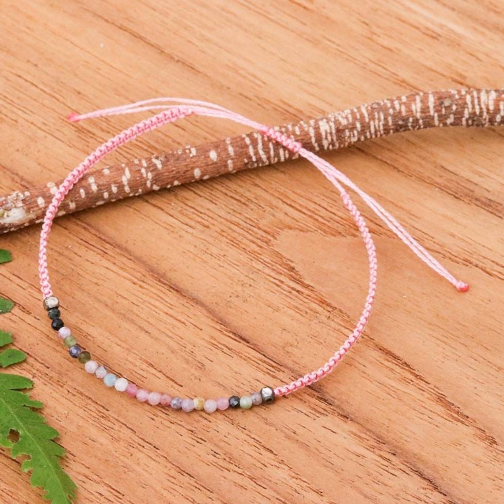 "A kaleidoscope of colorful beads dances along Arshad Ullah's stunning macrame pendant bracelet. Thai artisans expertly knot bright pink nylon cords and adorn them with vibrant tourmaline stones and petite silver-plated brass beads. The adjustable knot ensures this chic accessory is as versatile as it is eye-catching."