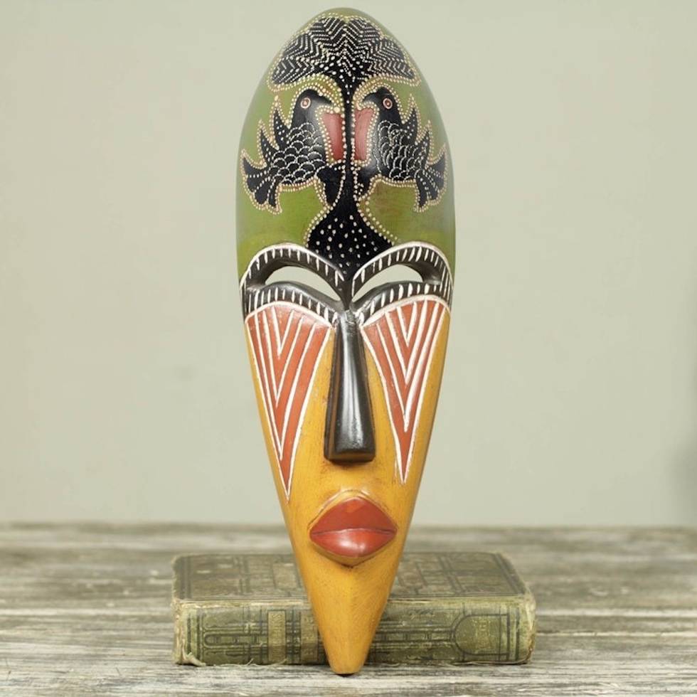 "This unique mask design is the inspiration of Ghanaian artisan Daniel Quarcoo. Two eagles flank a tree on the forehead of the mask; the designs are carefully etched in the wood in a series of small dots. Crescent-shaped eyes are underscored by triangular shapes on the cheeks and a long, straight nose. The mask is hand-painted in shades of green, yellow, brown and black."