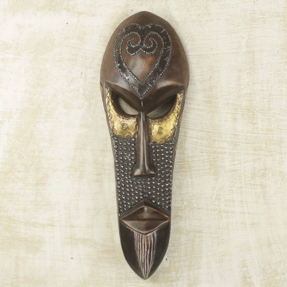 We have a large selection of masks and love the texture of this one. It is made of wood with detailed aluminum covering the base. It is well made and will be a great addition to our other masks. It is called 'Mbara Hunter' which truly fits the mask.