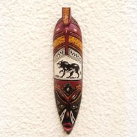 "This unique, oblong mask is the creation of Ghana's Joseph Boateng. The artisan hand carves the mask from local sese wood, sands the surface smooth, then decorates the piece with textured aluminum plate and the image of a lion. The mask is called Atongo, a Northern Ghanaian male name."