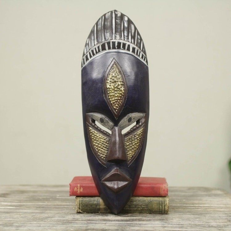 We have a large selection of masks and love the texture of this one. It is made of wood with detailed aluminum covering the base. It is well made and will be a great addition to our other masks. It is called 'Mbara Hunter' which truly fits the mask.