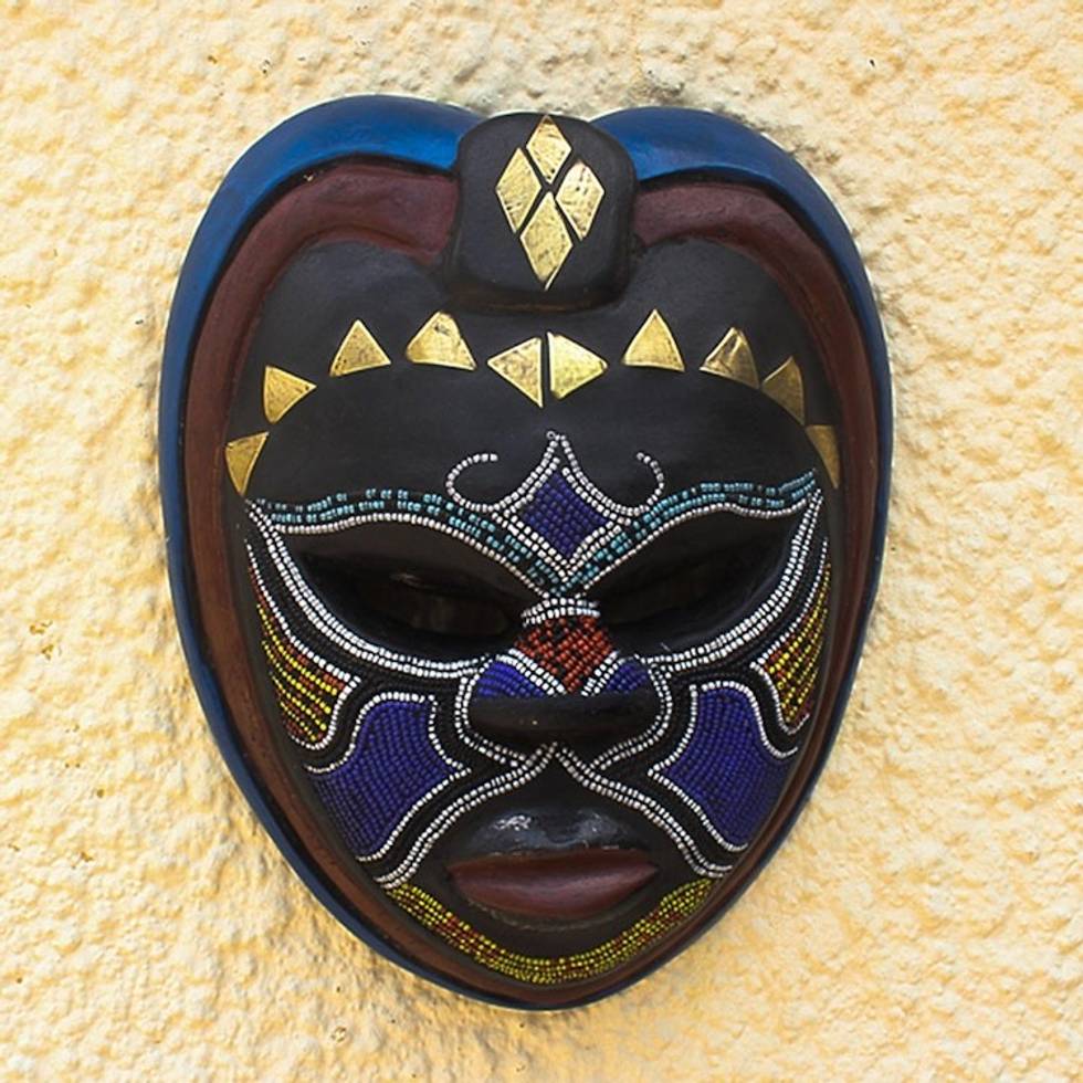 African Wood Wall Mask with Brass and Beading 'Kande' Item ID: 2671806269