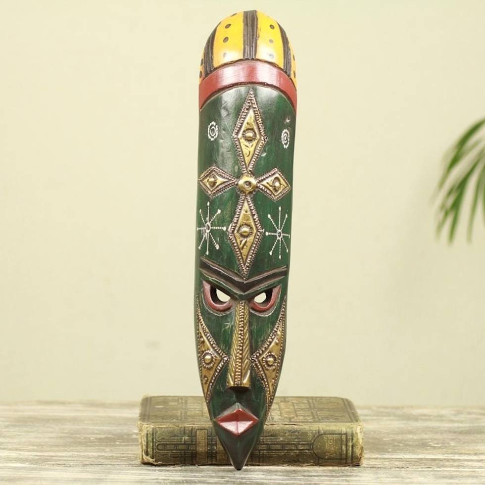 African Wood Wall Mask with Star in Embossed Brass 'Stargazer' Item ID: 2671800978