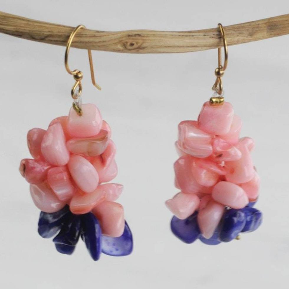 "Beautiful hues of peach and blue shine throughout these gorgeous cluster earrings hand crafted by Harriet Faako Adjei of Ghana. The earrings feature agate chips and brass hook ear wires."