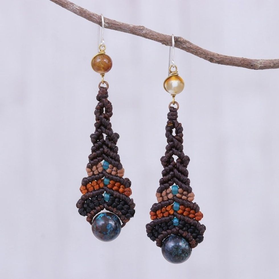 Agate Macrame Beaded Dangle Earrings 'Raindrop in Brown' Item ID: 2671799957