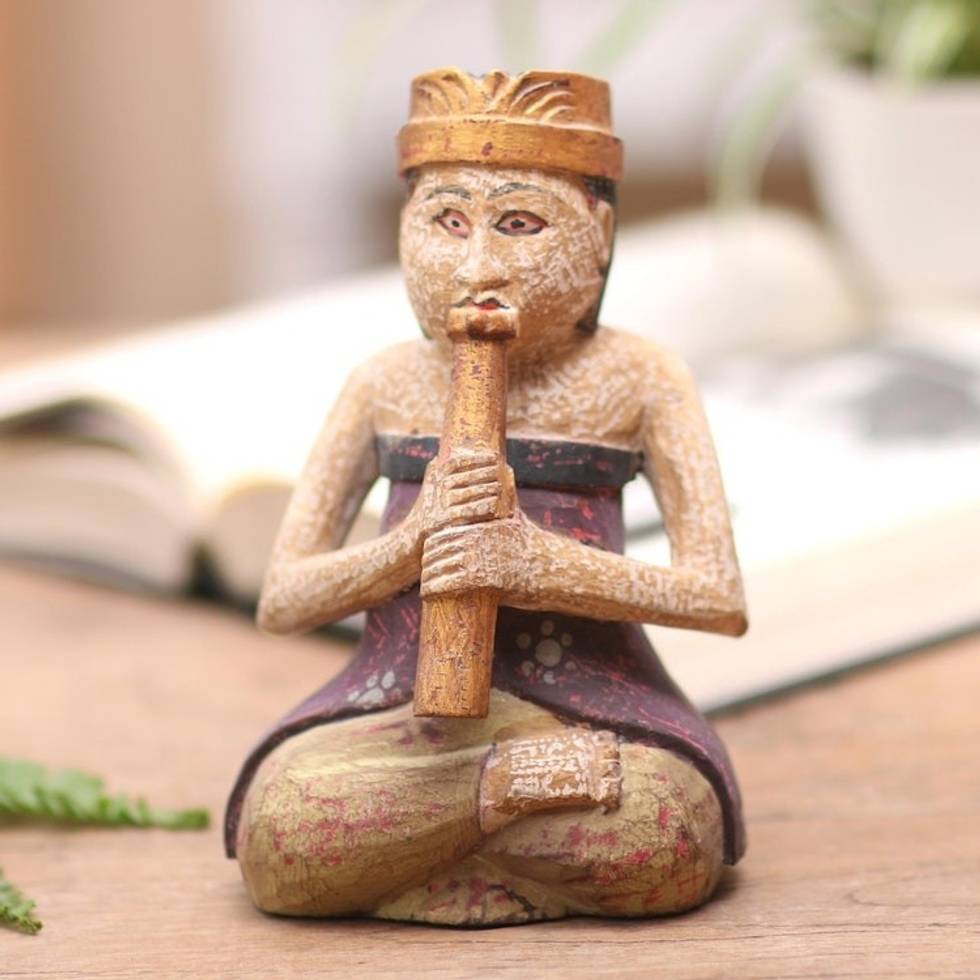 "Music in the morning can help heal your soul. Presented by Anak Agung Ary in Bali, this charming statuette plays the flute before beginning the day. The figure is hand carved from albesia wood, painted in bright colors, and treated with a distressed finish."