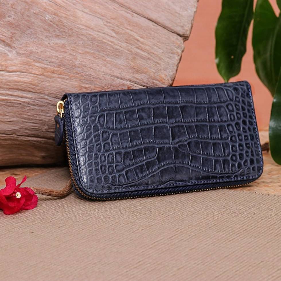 "A sleek alligator print can transform any element into a fancy statement. Ideal for busy days at the office or elegant outings with loved ones, Thai artisan Suchada's wristlet wallet is entirely made from leather and has a detachable strap that makes it versatile. With a steel blue hue embellishing the whole accessory, it also features a nylon-lined interior equipped with twelve card slots, three handy compartments, two generous pockets and a little coin pouch. On top of that, the design is secured with a main zipper closure that will keep everything in place."