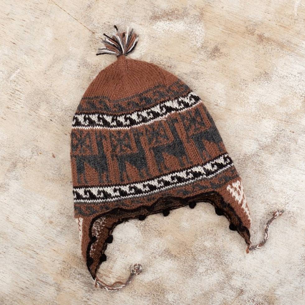 Alpaca Blend Chullo Hat with Llama Patterns in Redwood Hues 'Llama Silhouette in Redwood' Item ID: 2669908161