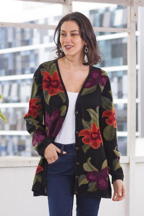 Alpaca Intarsia Knit Cardigan In Multicolored Floral 'Cusco Flowers in Black' Item ID: 2671820350