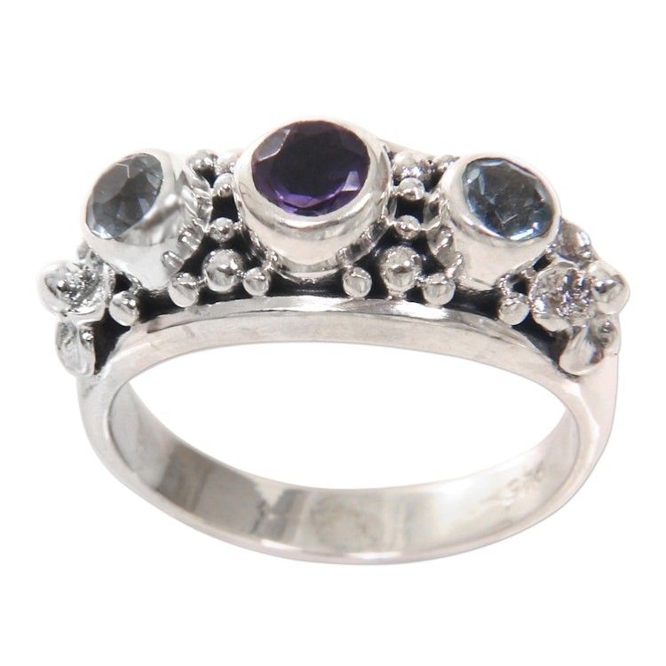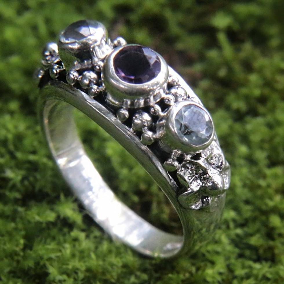Amethyst and Blue Topaz Sterling Silver Floral Ring 'Seminyak Blossoms' Item ID: 2671702452