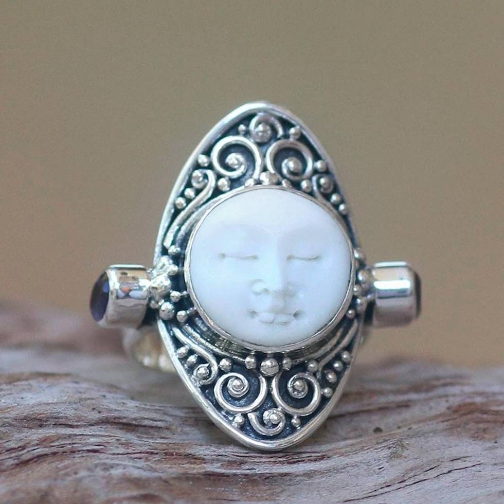 Amethyst and Bone Cocktail Ring Crafted in Bali 'Tranquil' Item ID: 2671736374
