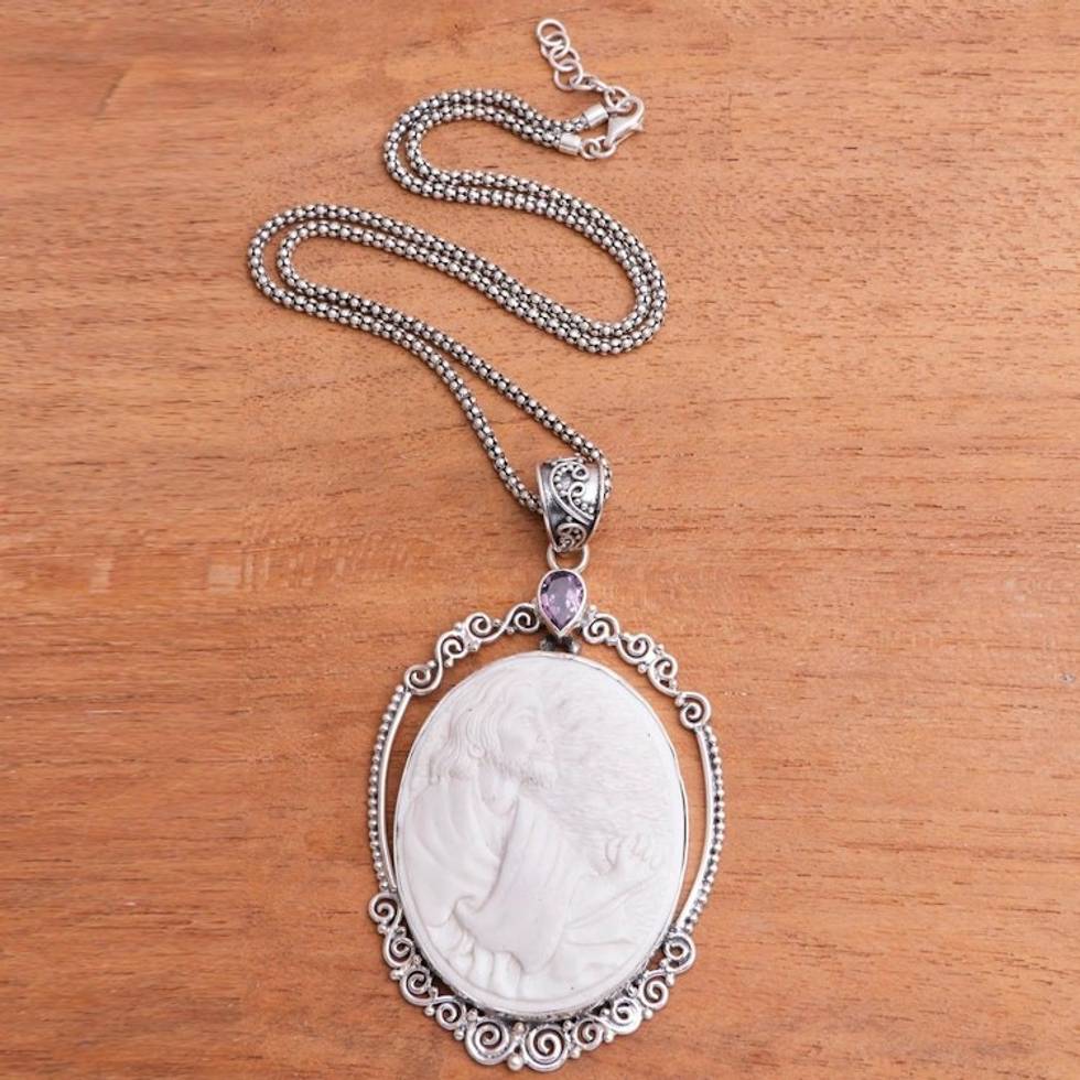 Amethyst and Bone Jesus Pendant Necklace from Java 'Gethsemane Prayer' Item ID: 2671736660