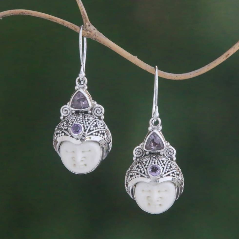 Amethyst and Carved Bone Dangle Earrings from Bali 'Celuk Pangeran' Item ID: 2671735955
