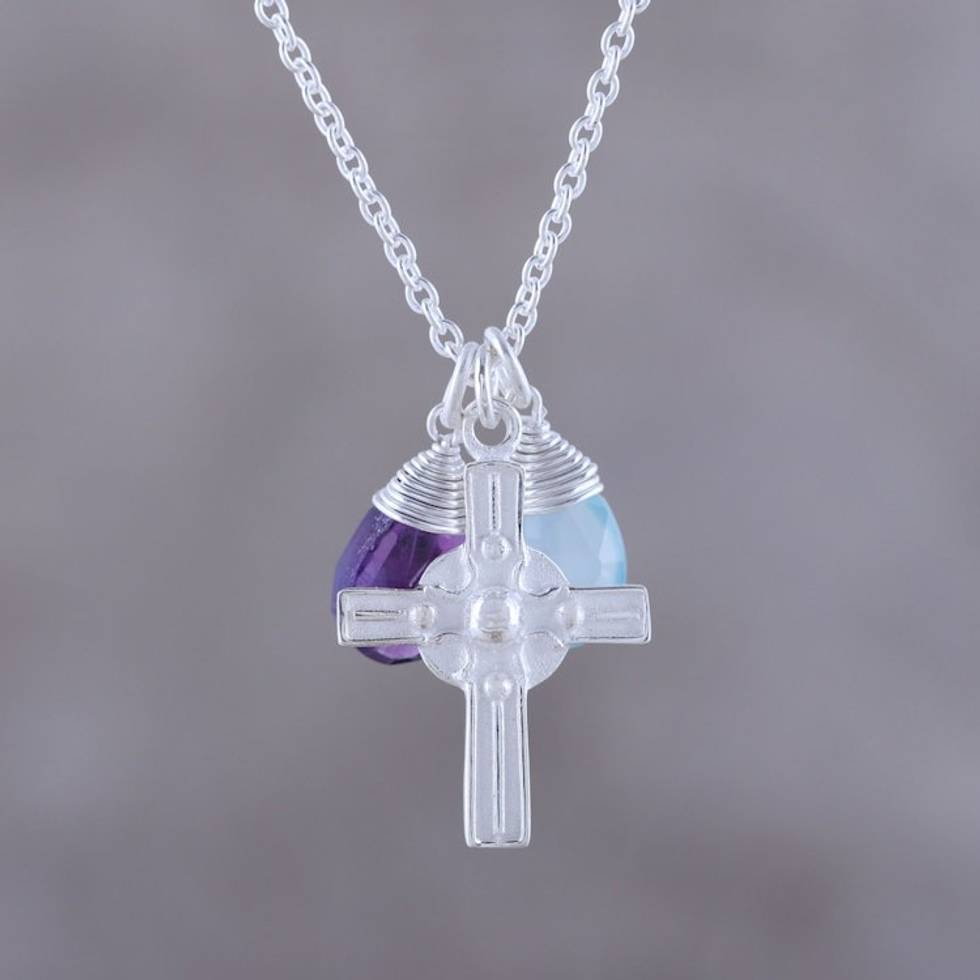 Amethyst and Chalcedony Cross Pendant Necklace from India 'Christian Elation' Item ID: 2671792508