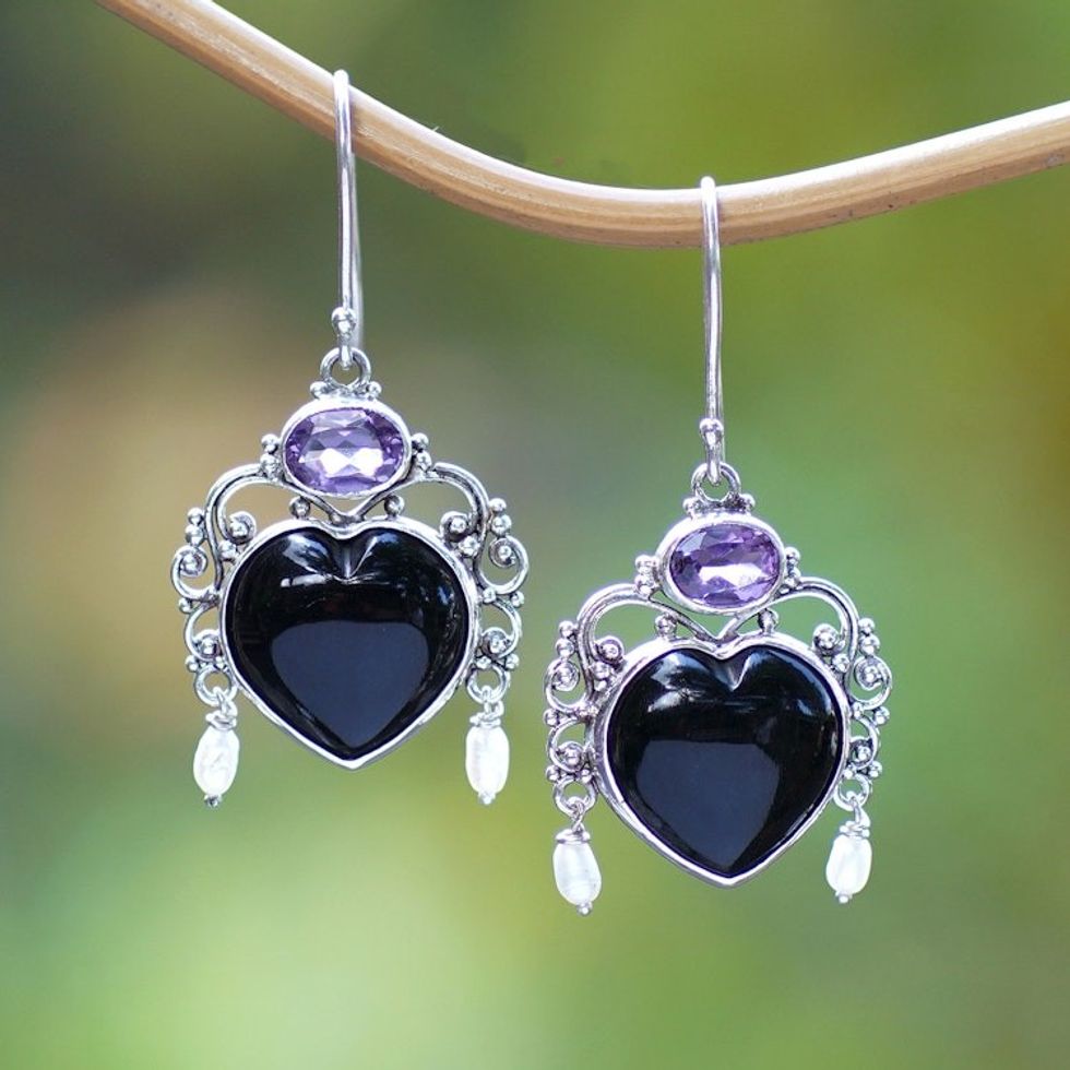 Amethyst and Cultured Pearl Heart Dangle Earrings from Bali 'Love Like Midnight' Item ID: 2671763249