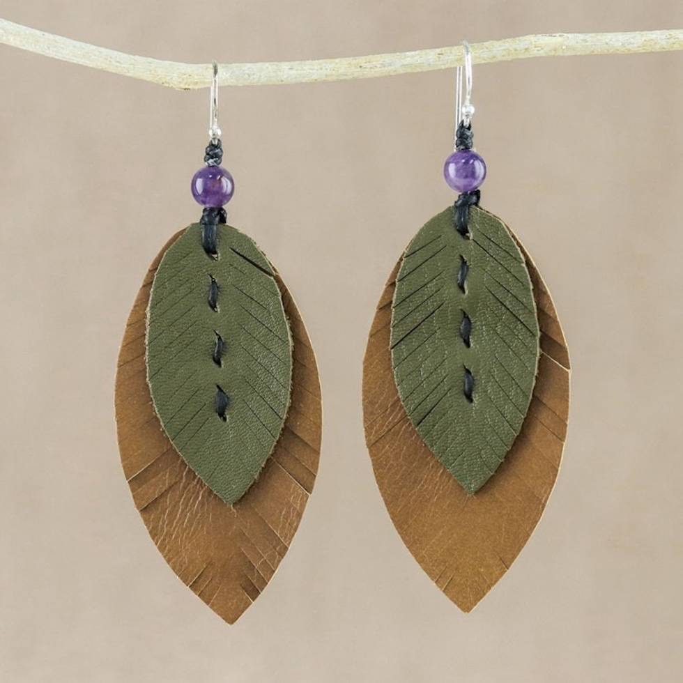 Amethyst and Leather Leaf Dangle Earrings from Thailand 'Happy Leaves' Item ID: 2671799603
