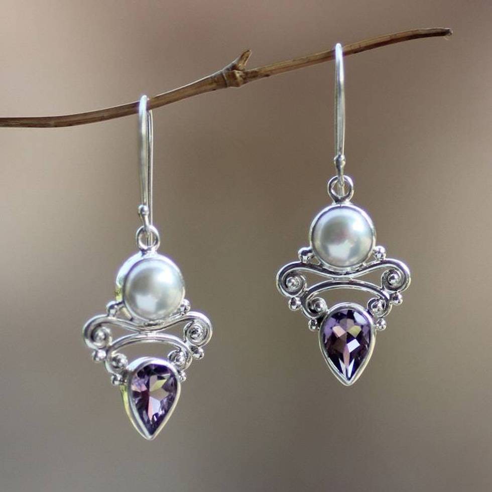 Amethyst and Pearl Dangle Earrings 'Guardian Moon' Item ID: 2676659022