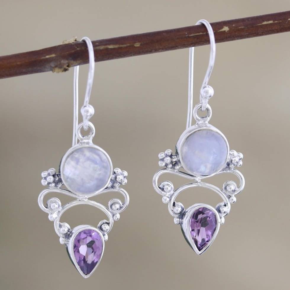 Amethyst and Rainbow Moonstone Dangle Earrings 'Mystic Tide' Item ID: 2669924156