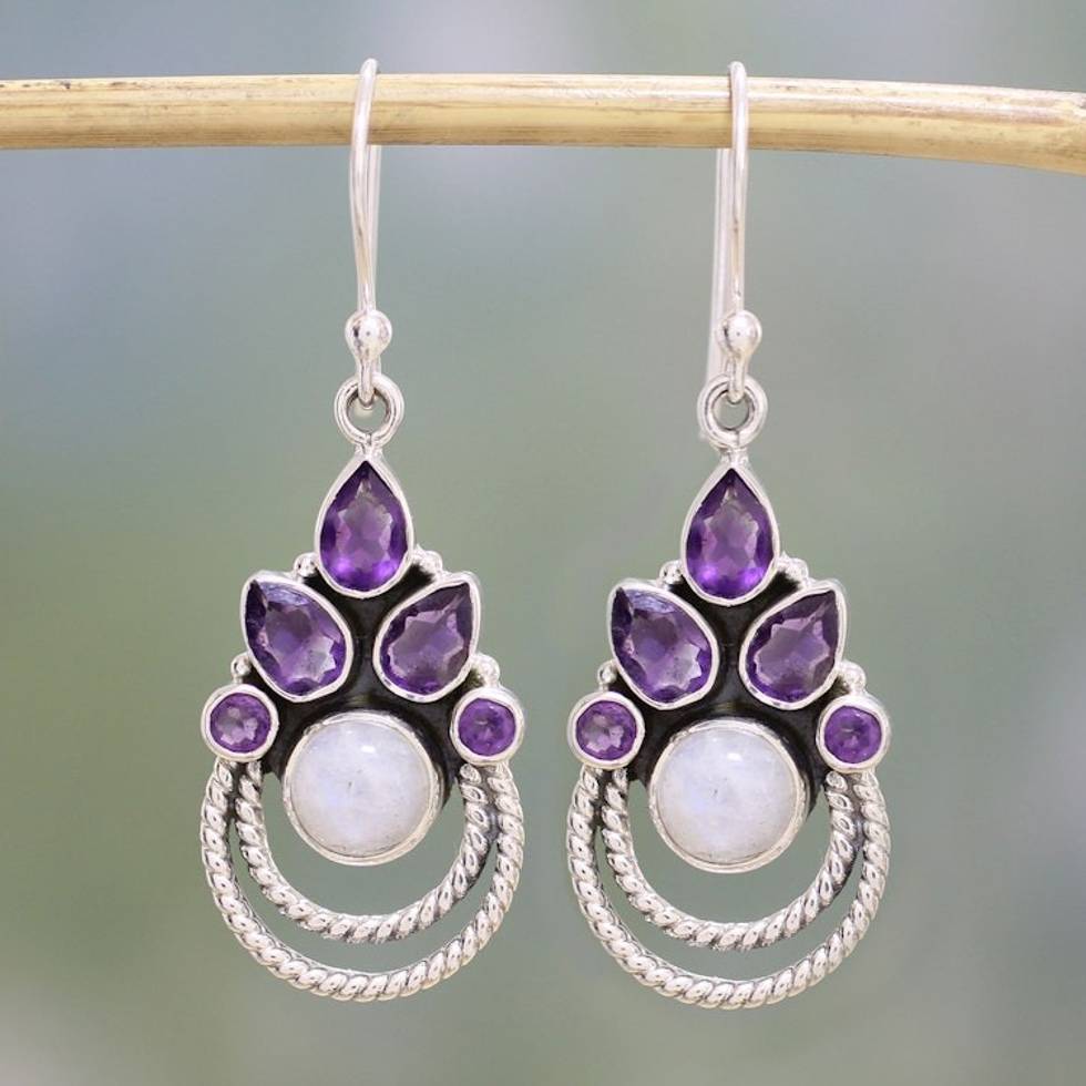 Amethyst and Rainbow Moonstone Dangle Earrings from India 'Exotic Crowns' Item ID: 2671791131