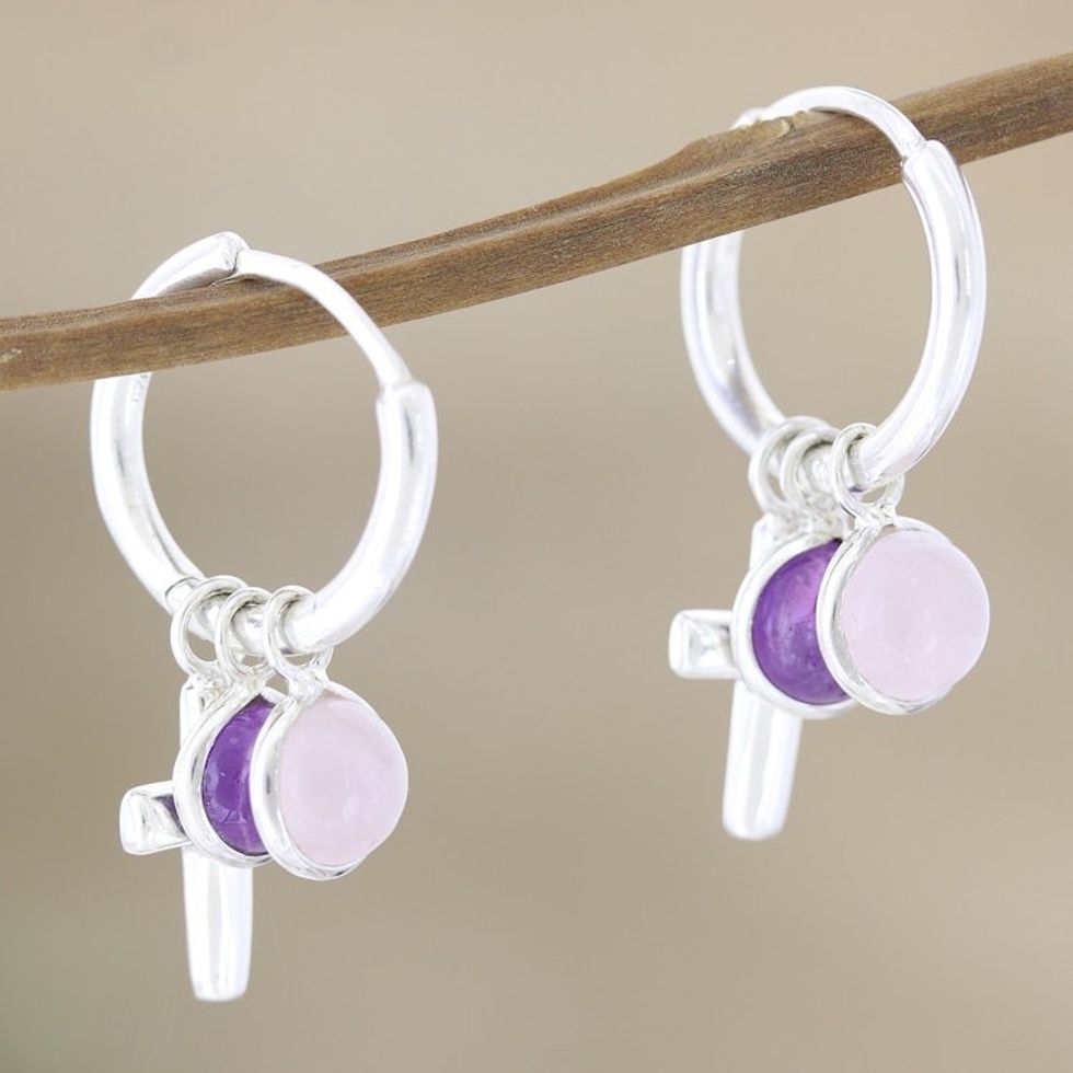 Amethyst and Rose Quartz Earrings with Cross Motif 'Soft and Sweet' Item ID: 2671789194