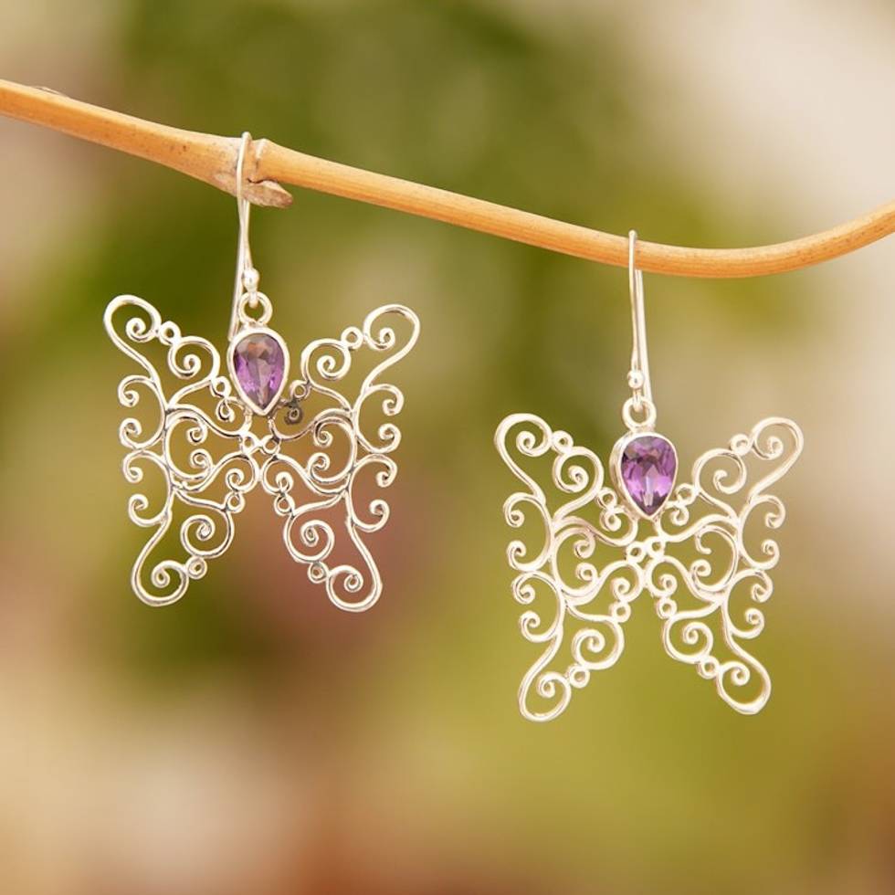 Amethyst and Sterling Silver Butterfly Earrings from Bali 'Butterfly Swirls in Purple' Item ID: 2671472731