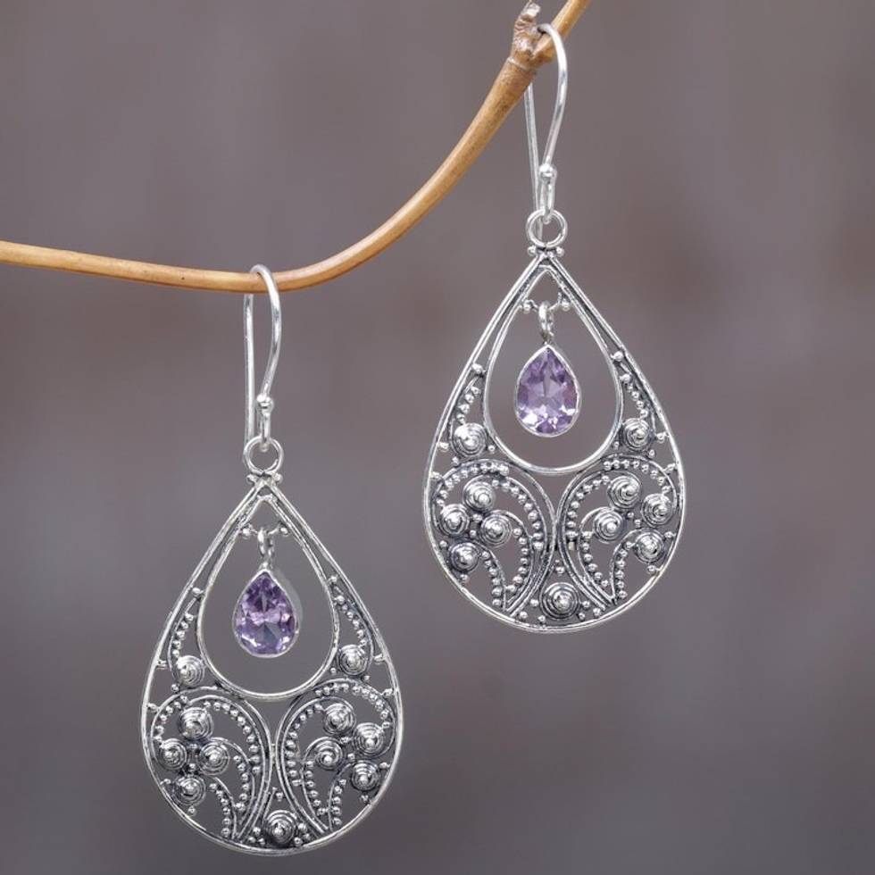 Amethyst and Sterling Silver Dangle Earrings 'Bali Crest' Item ID: 2671701771