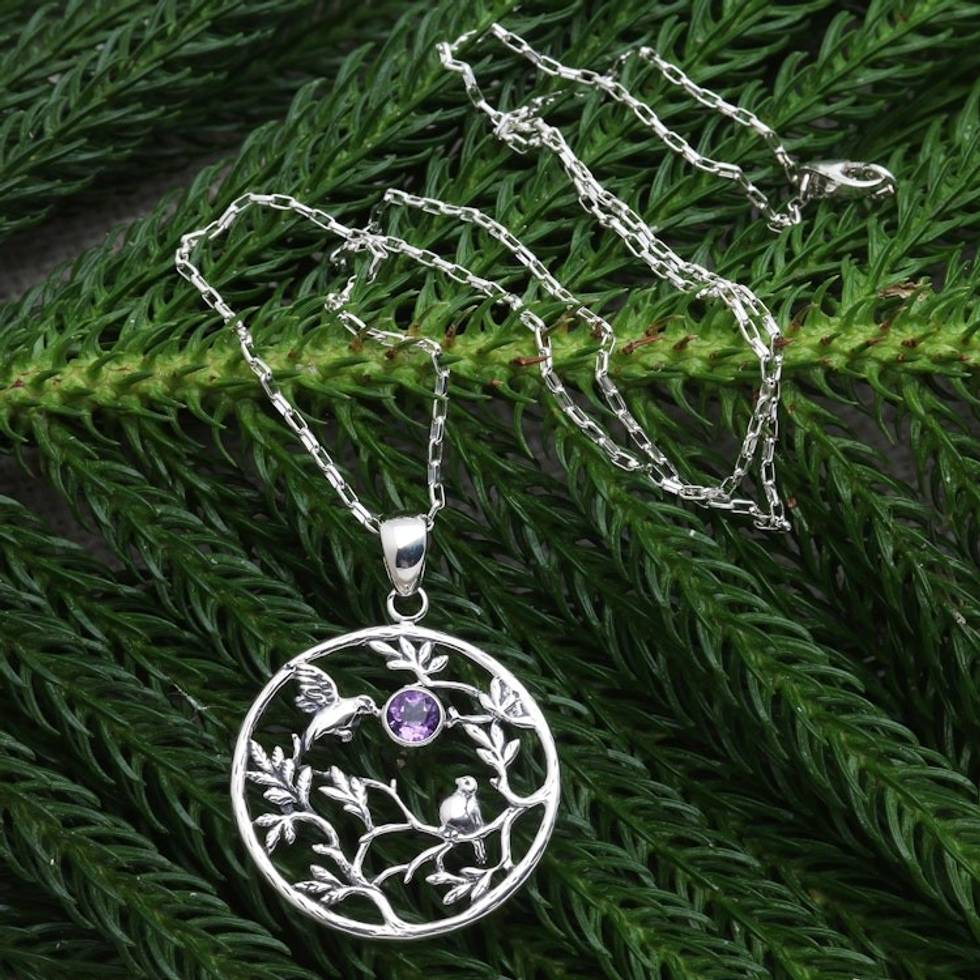 Amethyst and Sterling Silver Hummingbird Pendant Necklace 'Hummingbird Tree' Item ID: 2669921248