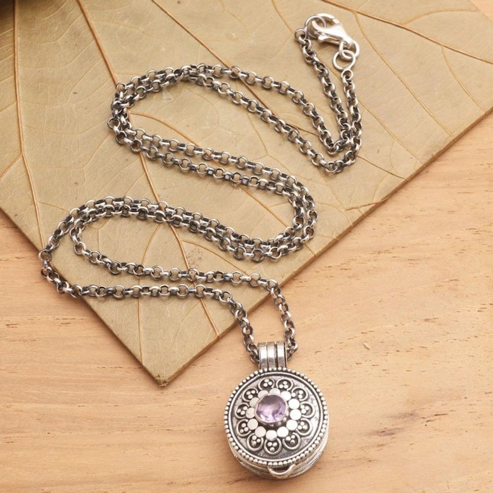 Amethyst and Sterling Silver Locket Pendant Necklace 'Gianyar Grace' Item ID: 2671737746