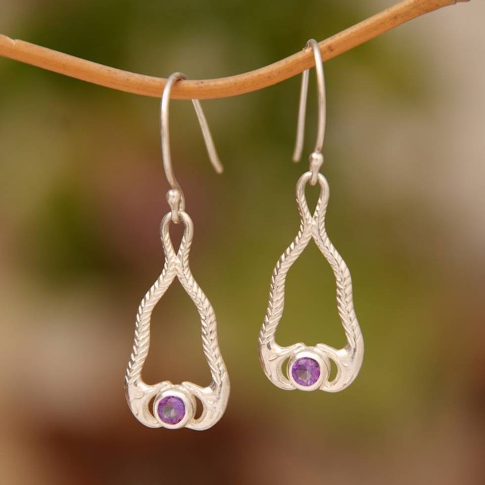 Amethyst and Sterling Silver Snake Dangle Earrings from Bali 'Serpentine Talismans' Item ID: 2671733728